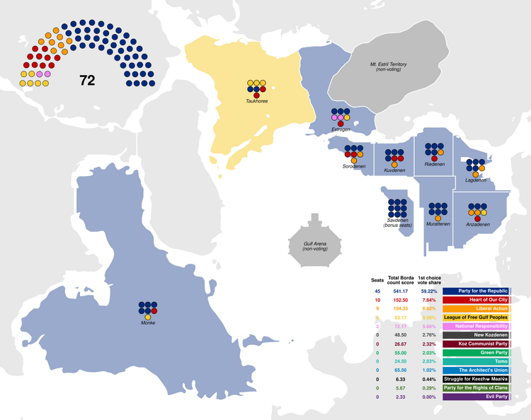 Party for the Republic, the party backed by Saevakki, won 59% of first-choice votes, once again winning the vast majority of seats due to this, including the 9 bonus seats reserved as the Savdenen constituency. Party for the Republic attained the majority of first-choice votes in every constituency except Sorodenen - where they nonetheless received the highest Borda count score - and Taukhoree, which instead saw the League of Free Gulf Peoples as the largest party.