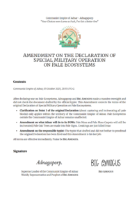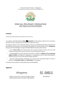 On 23:30 UTC+2, 5 October 2025, Adnagaporp published its initial declaration of military operation on pale ecosystems[1]. It was absolutely intended for the scope of this military operation to include pale gardens outside of Adnar once the Adnar’s pale garden is dealt with, but this was soon noticed by several governments. Facing false criticism from hostile governments, Adnar released an ad-hoc amendment, claiming to the ŋorld that the unpaleing will only happen inside Adnar[2], even inventing the story of “firing the government typist” to distract them.