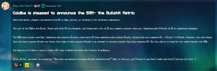 Just in case Coldba would take offense at another country using the scale before the ruler was complete, the Madness Multiverse Office of Society created an alternative, the Stupid Scale. The Stupid Scale uses the pale oak sapling (POS) as its unit, after the claims made in the greenification of Adnar, which were determined to be mostly stupid. While this is a stupidity scale, not a bullshit scale, the Madness Multiverse Office of Society says that bullshit is stupid, and so defined 1 pale oak sapling as equal to 39.3701 Breels. Because 39.3701 Breels is an absurd amount, ratings are usually given in centiPOS.