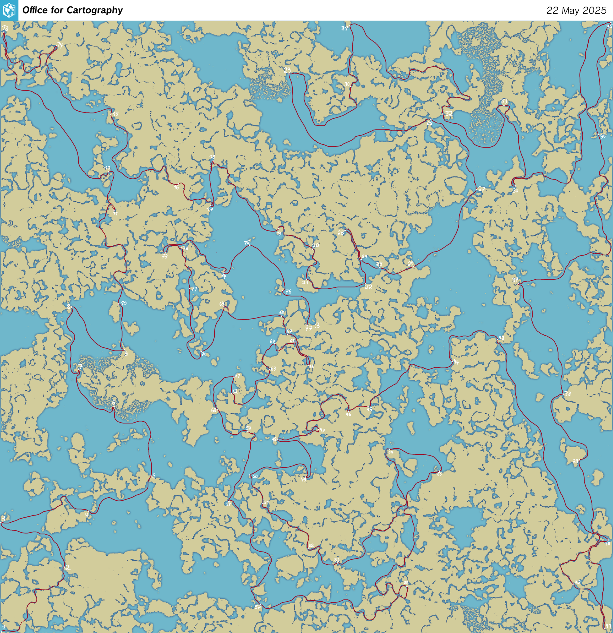 A map of all the tour de nguh checkpoints, and a suggested route. Overland trips are indicated with dashed lines.