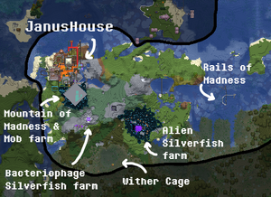 Janus' Madlands house is a strange formation built near the monster farm made of several outdoor rooms including a maze and with long, winding single-block or parkour pathways between rooms. Notable rooms include the Piss Room and the Balls Room. This house is a major attraction and saw visitation from several players on the first day of its construction. Sq also contributed to building the Amogosroom and the Wrong Way, Doofus! Room. The official animal of JanusHouse is the Herpes Ghast, who lives in an ugly house.